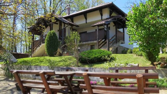 The entire house and property are available for guests – a large living room with a fireplace, a kitchen for self-catering, and a glass external terrace with a view of the surroundings, serving as a space for dining and socializing.